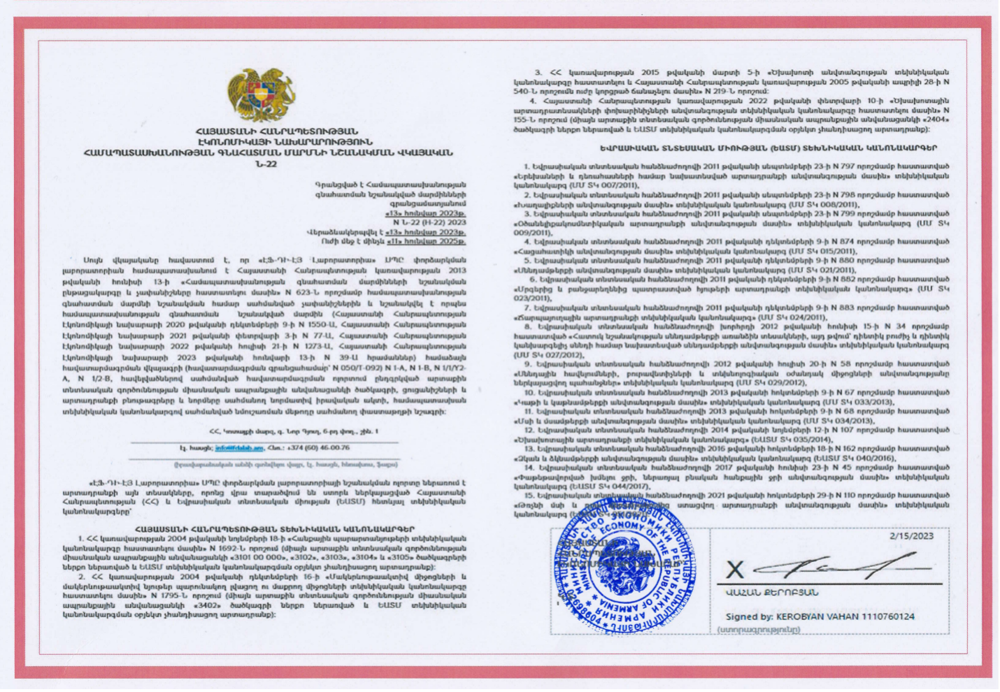 «ԷՖ-ԴԻ-ԷՅ Լաբորատորիա» ՍՊԸ-ն համապատասխանում է ՀՀ կառավարության 2013 թ. հունիսի 13-ի «Համապատասխանության գնահատման մարմինների նշանակման ընթացակարգը և չափանիշները հաստատելու մասին» N 623-Ն որոշմամբ սահմանված չափանիշներին և նշանակված է որպես համապատասխանության գնահատման մարմին՝ ՀՀ Էկոնոմիկայի նախարարության կողմից։