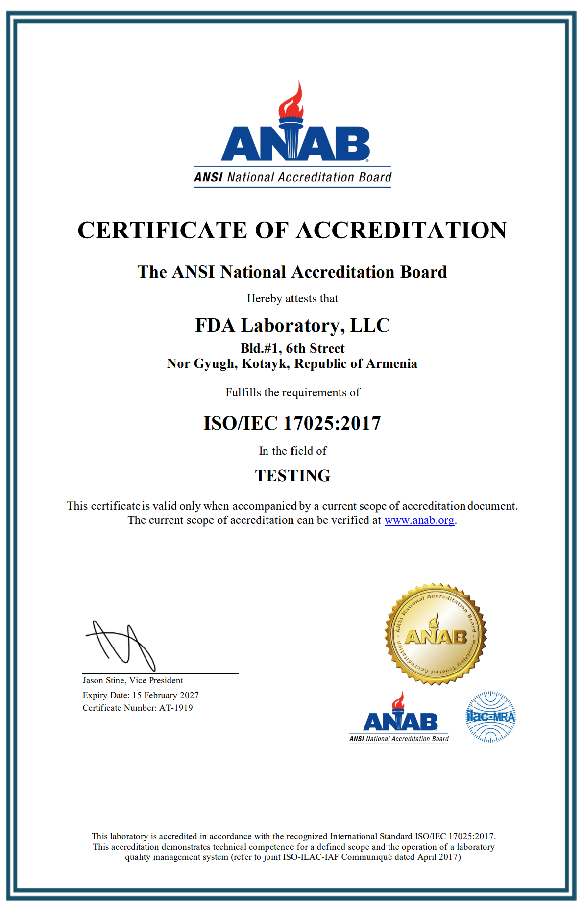 «ԷՖ-ԴԻ-ԷՅ Լաբորատորիա» ՍՊԸ-ն Հայաստանում առաջին փորձարկման լաբորատորիան է, որը հավատարմագրված է ISO/IEC 17025:2017 միջազգային ստանդարտի պահանջներին համաձայն՝ ANSI National Accreditation Board՝ ANAB-ի կողմից։
