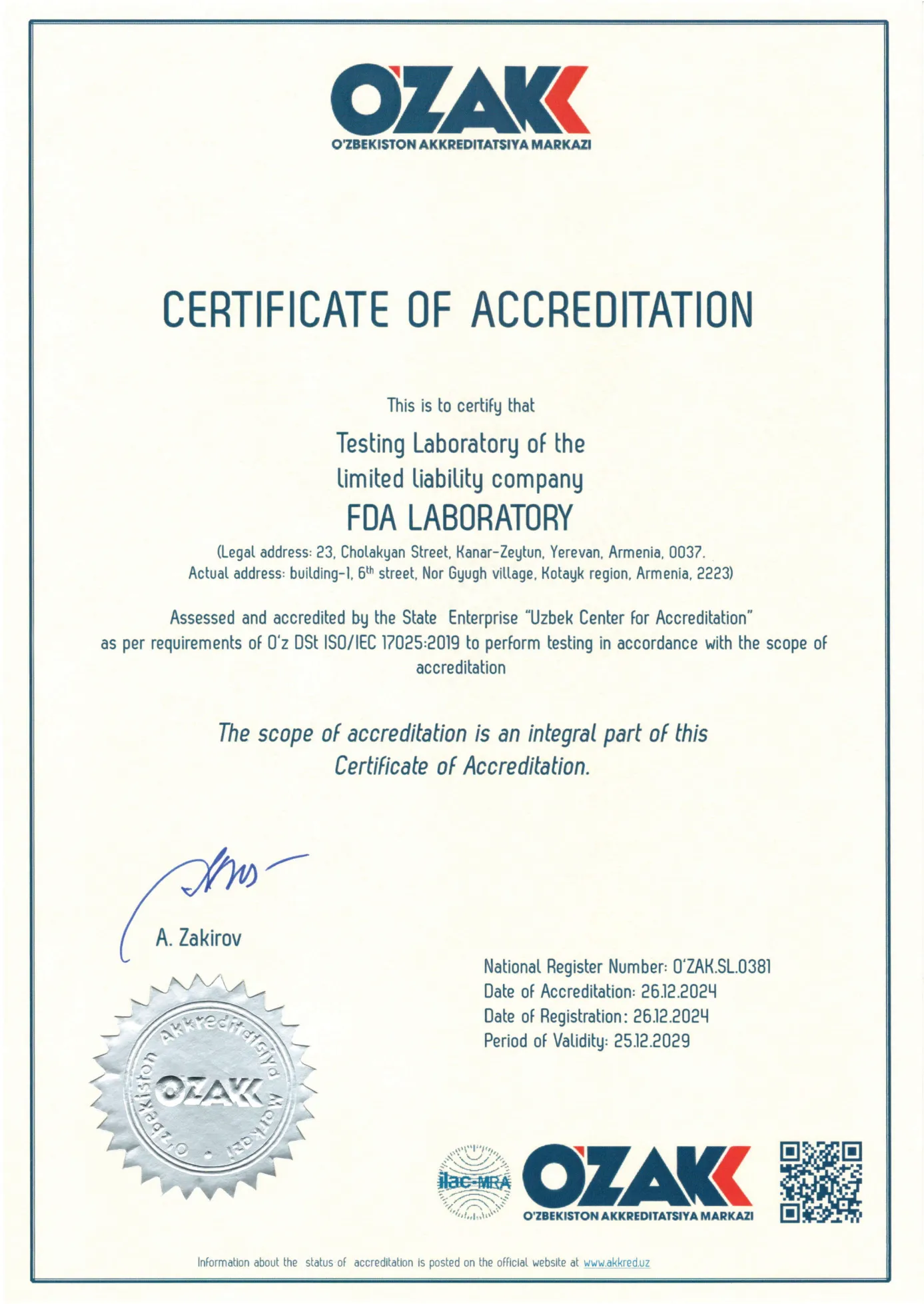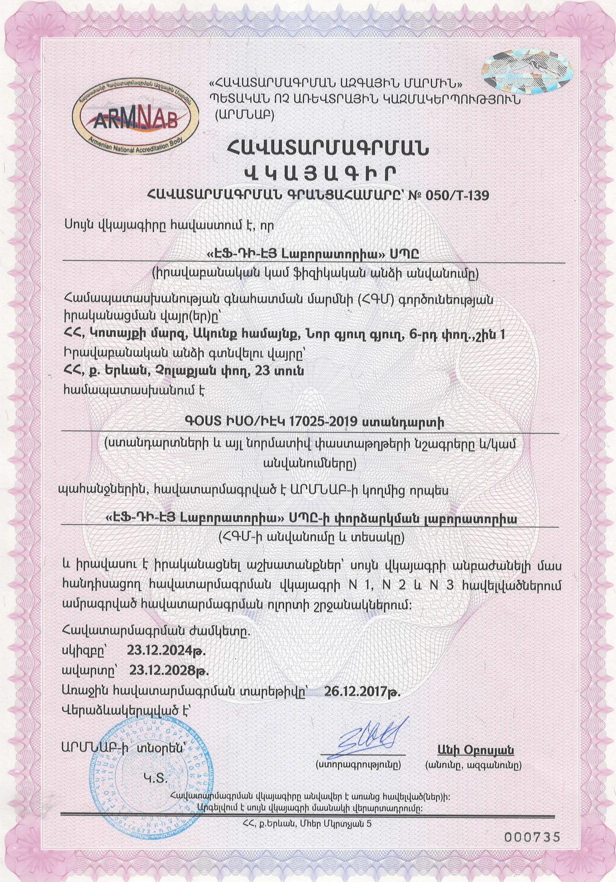 «ԷՖ-ԴԻ-ԷՅ Լաբորատորիա» ՍՊԸ-ն հավատարմագրված է նաև «Հավատարմագրման ազգային մարմին» ՊՈԱԿ-ի կողմից՝ համապատասխանելով ԳՕՍՏ/ԻՍՕ ԻԷԿ 17025-2019 ստանդարտի պահանջներին: