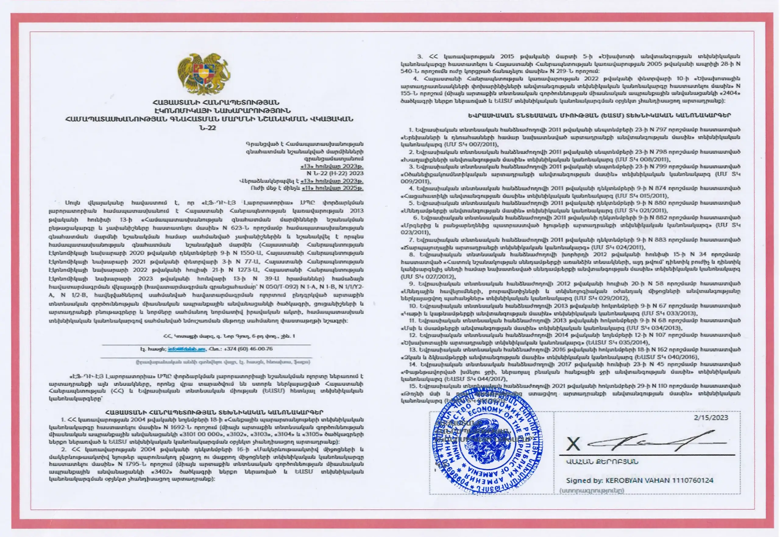«ԷՖ-ԴԻ-ԷՅ Լաբորատորիա» ՍՊԸ-ն համապատասխանում է ՀՀ կառավարության 2013թ. հունիսի 13-ի «Համապատասխանության գնահատման մարմինների նշանակման ընթացակարգը և չափանիշները հաստատելու մասին» N 623-Ն որոշմամբ սահմանված չափանիշներին և նշանակված է համապատասխանության գնահատման մարմին՝ ՀՀ Էկոնոմիկայի նախարարության կողմից: